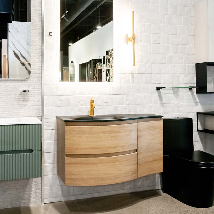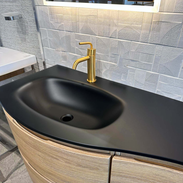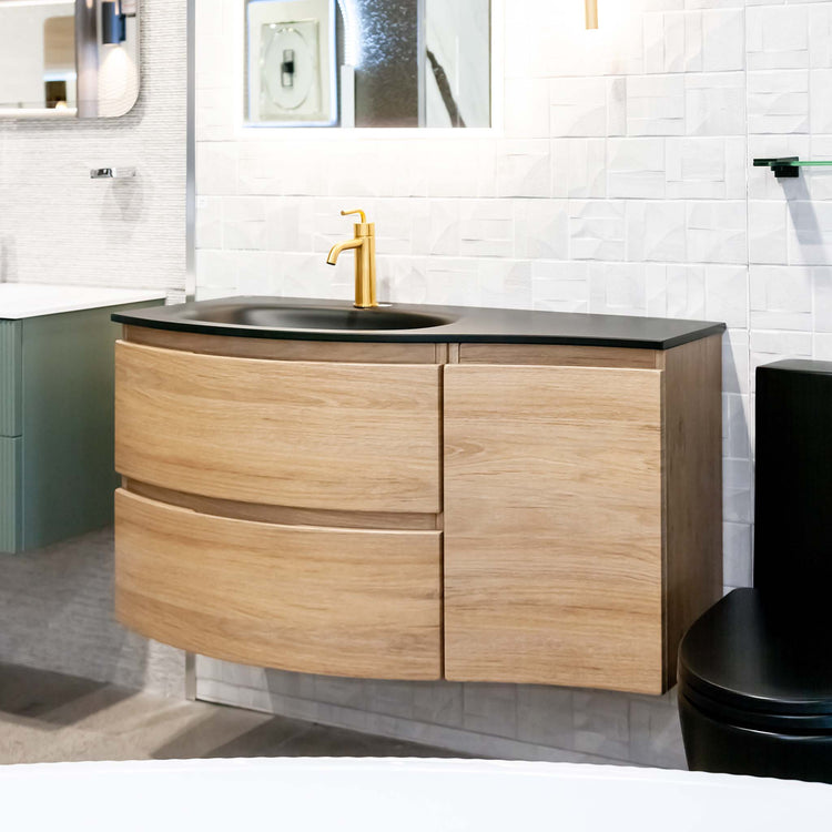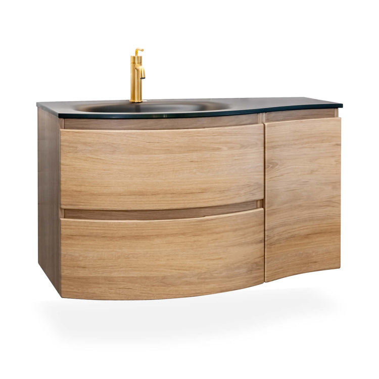 Exterior doors and central drawers with self-braking closing system for a bathroom concept centered on the rationality of the shapes and the practicality of the use.