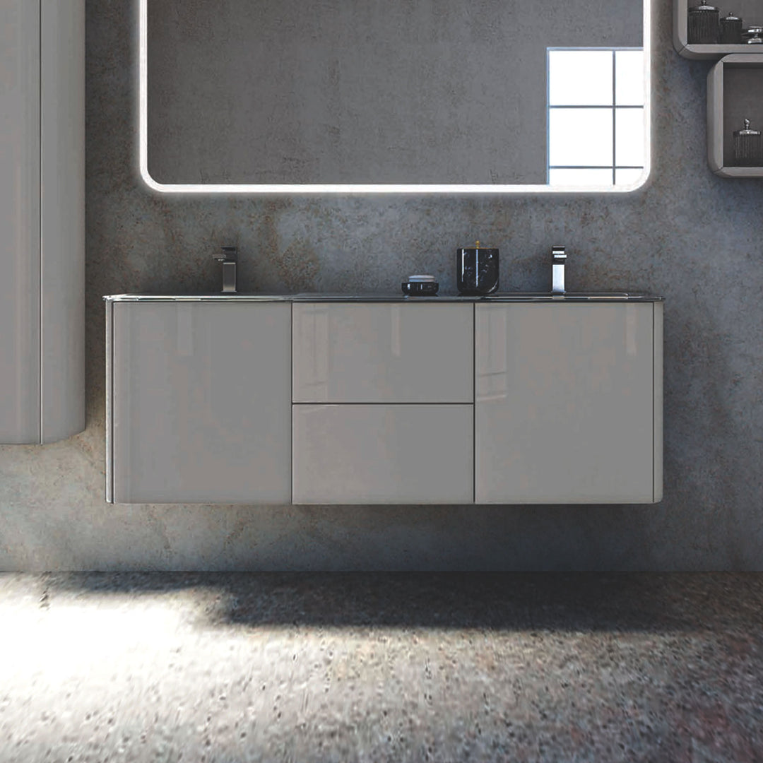 New design and functionality for the Liverpool line: a container cabinet with rounded sides that resemble the top of the top integrated in extra light crystal, multifunctional drawers with practical push system and sliding closure where technological function and aesthetic component cleverly melt.