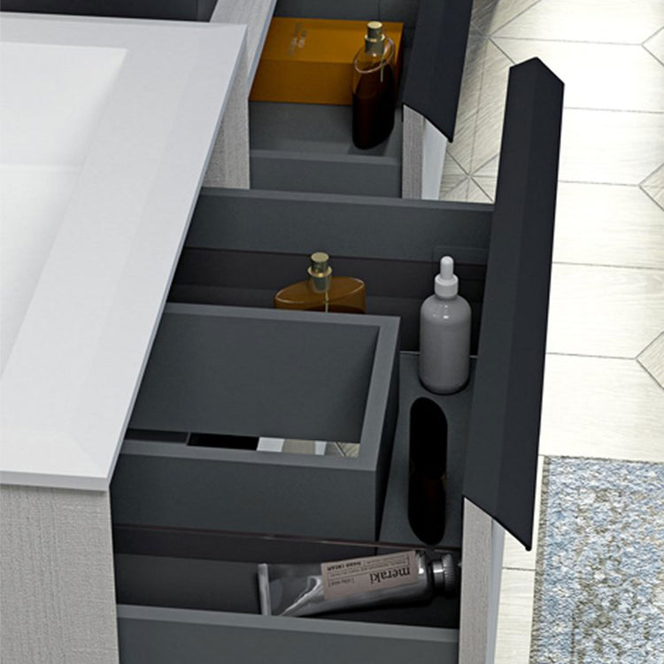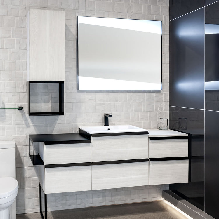 Available in two wood finishes, Bruges Oak and White Rock, the Collection is based on the simplicity of the lines enhanced by 45-degree gleanings and the functionality of the countertops, available in wood or metal finish with the practical side accessories. The cubes in black plate and the wooden wall units, combined with the profiled metal mirrors with integrated double LED, complete the Qubo line, giving it the dynamism and versatility of the industrial style.