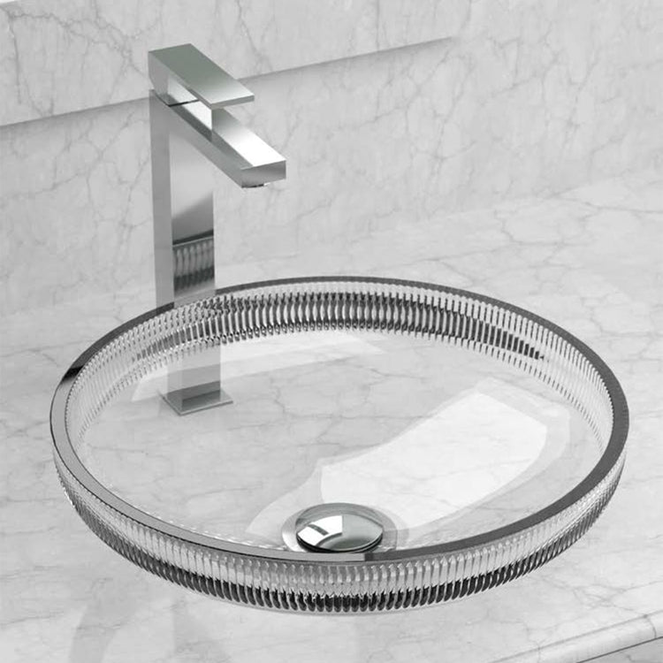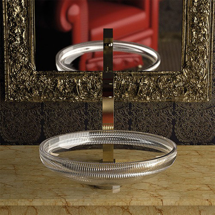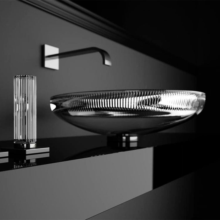 CLIVIA countertop washbasin in the purest clear crystal 24% pb, hand beveled in stone. The linear groove cast in stone awakens the essential flavor of Gothic art, interpreting it in a minimalistic and contemporary tone.
