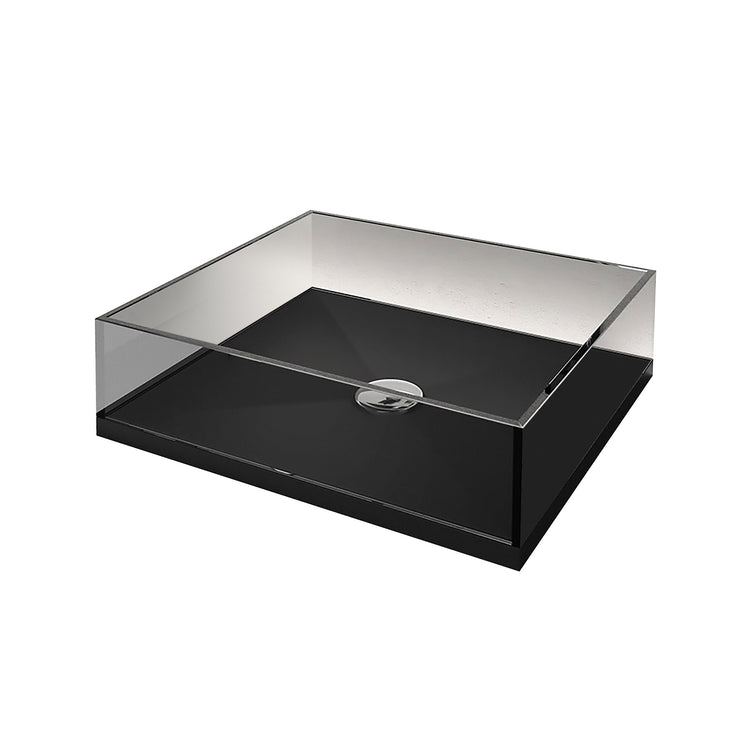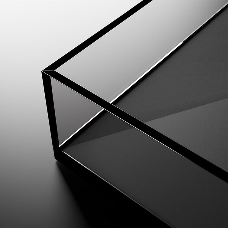 Minimal yet precision detailing that captures the light and displays geometries in a pure and essential manner. Offering a combination of 45° bevelled glass from extra-white to the more sophisticated fume and impeccable assembly on a black or white Vetrofreddo ® solid base.