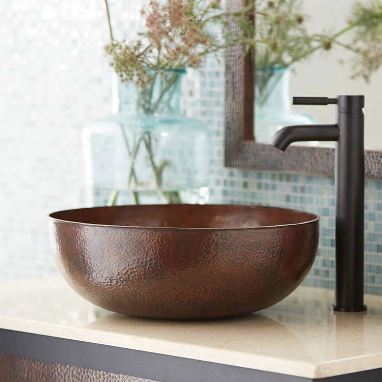 From the acclaimed Maestro Collection, Maestro Round vessel sink highlights the pinnacle of artisan crafted copper. Marvel at its unique hand-made texture, wrought from an estimated 30,000 strikes of the hammer! Maestro Round is also Earth-friendly, forged of high-quality recycled copper. Want to benefit from the bacteria-fighting power of copper? Studies show that uncoated copper can fight the growth of many bacteria which cause food poisoning, colds, and flu.