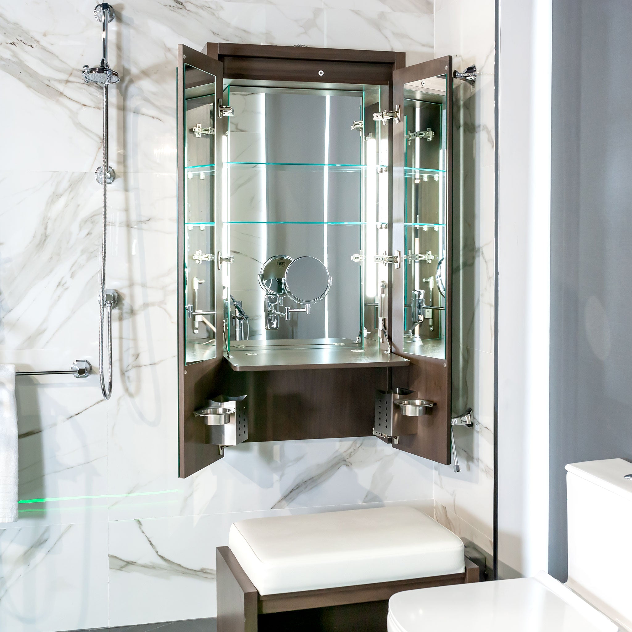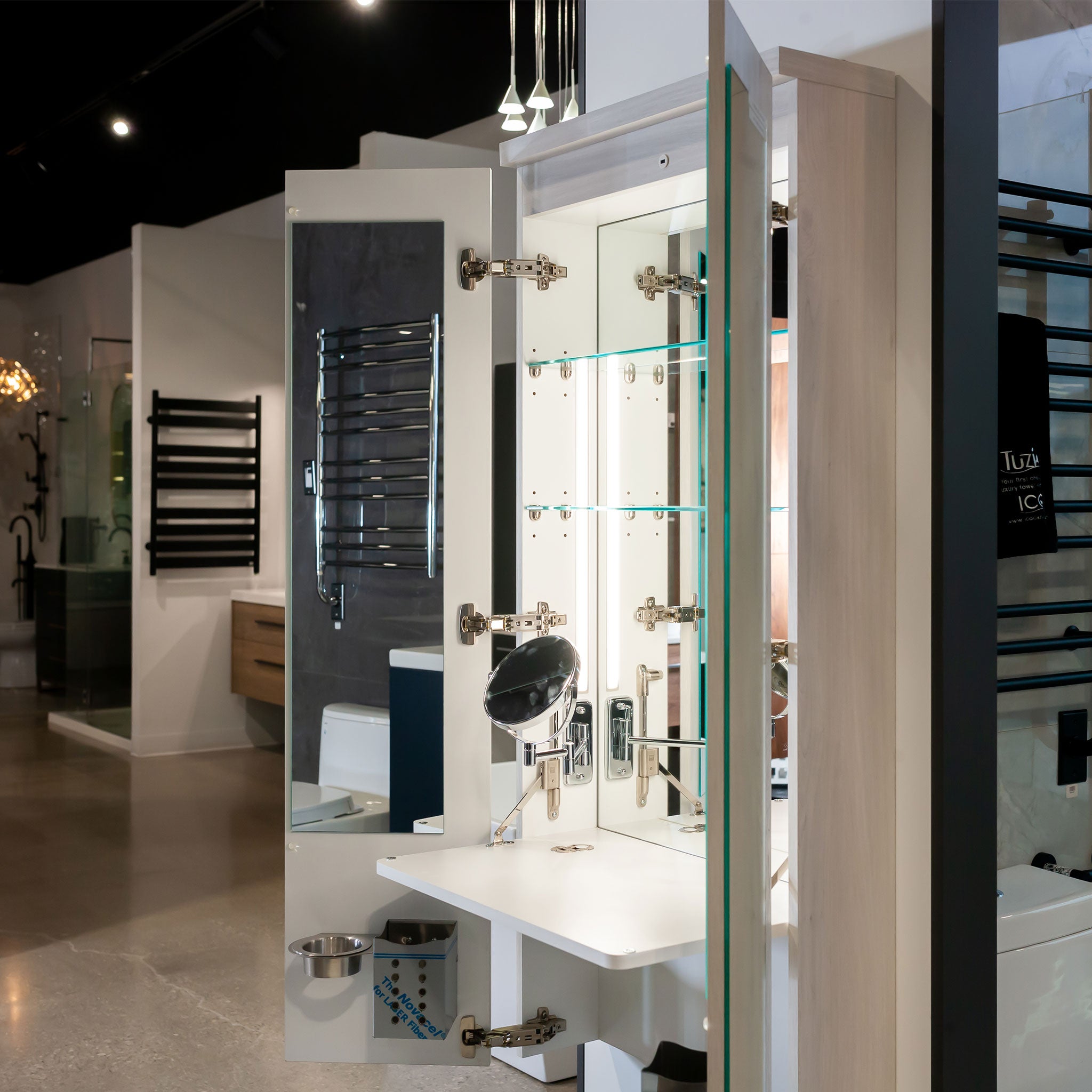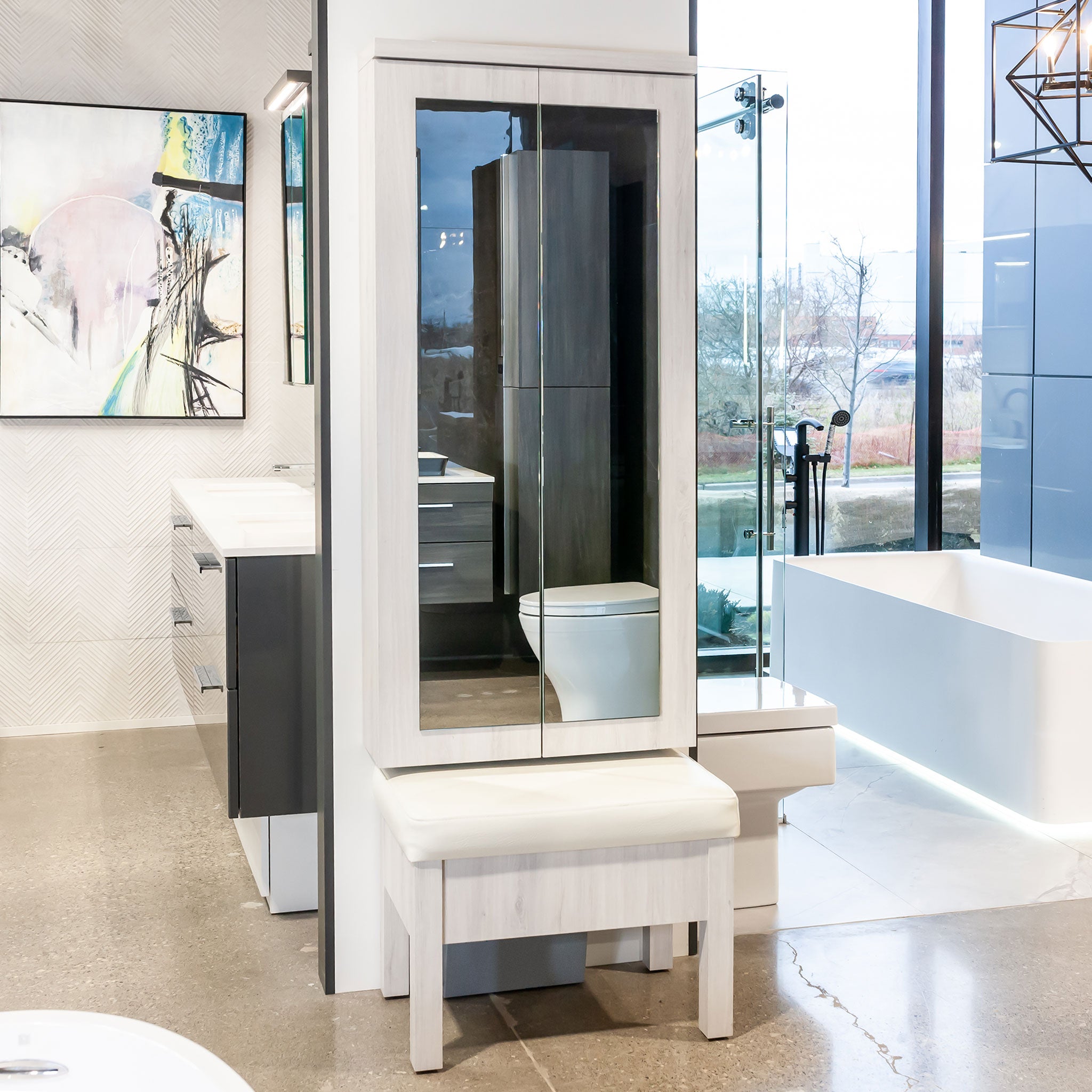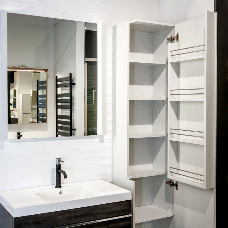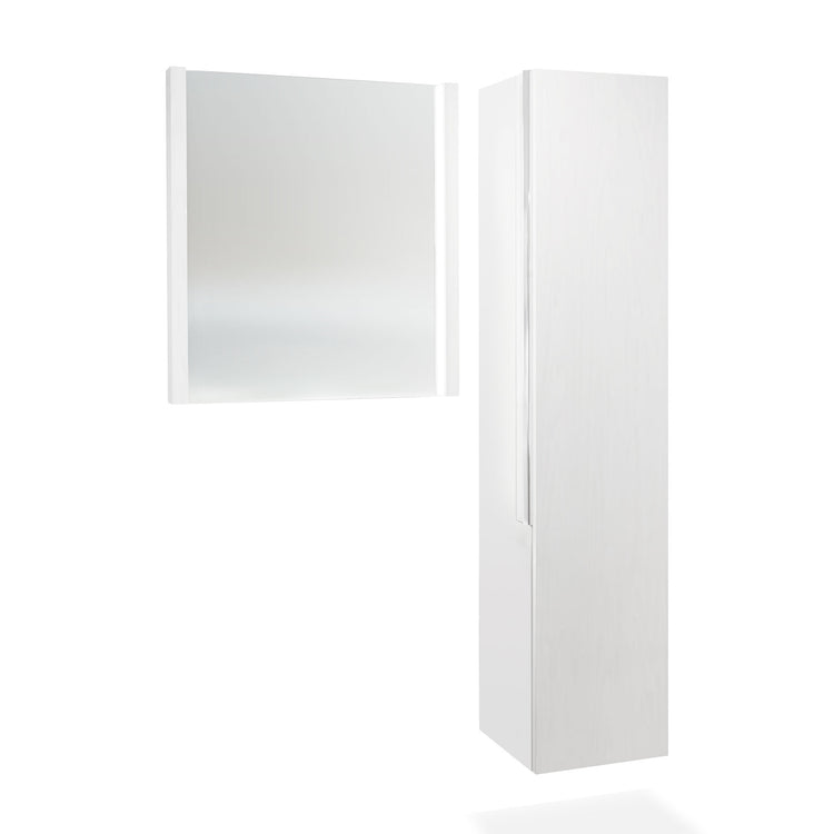 Versatile and compact, this 12" deep collection is designed to optimize the functionality and storage in a small bathroom. The mirror includes a LED lighting and the linen cabinet offers extra storage in the door.